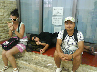 Spre deosebire de tariful unic de autocar aici un bilet a costat 4,1 lei, adica o cursa de la mine de acasa pana la gara din Constanta, cu microbuzul. Odata urcati in tren, am stat in picioare vreo 2 ore, cat s-a moscait trenul pana in Constanta. Odata ajunsi in Constanta, ca doar ne odihnisem (a se vedea mai jos) am luat unanima hotarare sa mergem in Mamaia, la plaja, lucru care l-am si facut. Dupa ce ne-am racorit cu cafea la terasa si o baie in mare, am atipit vreo o ora pe nisip, timp in care paznicul de serviciu ne cronometra si ne spunea cand sa ne intoarcem, asta ca sa nu ne ardem prea tare.
